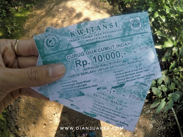 Untuk dapat memasuki kawasan Curug Goa Lumut Endah, kalian hanya merogohh uanga sebesar Rp. 10.000/orang untuk tiket masuk. Sementara untuk parkirnya dipatok Rp. 5.000 dan untuk mobil Rp. 10.000